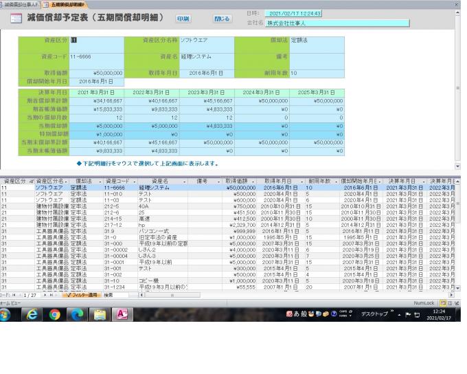 資産登録と同時に減価償却費を計算し、償却完了までの推移を確認できます。
